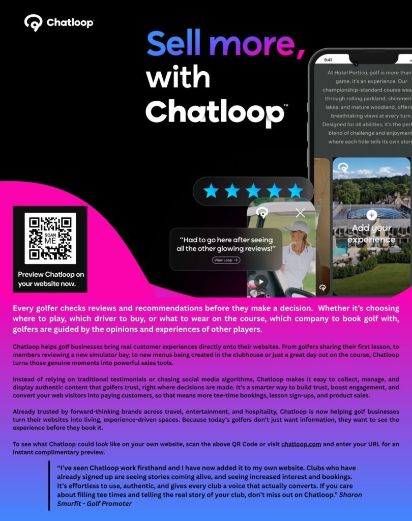 Chatloop allows golf clubs, resorts and golf businesses to showcase real golfer experiences directly on their website. By displaying authentic reviews, photos and videos from customers in the moment decisions are made, Chatloop builds trust, increases engagement and helps convert website visitors into tee-time bookings, lesson sign-ups and product sales.
